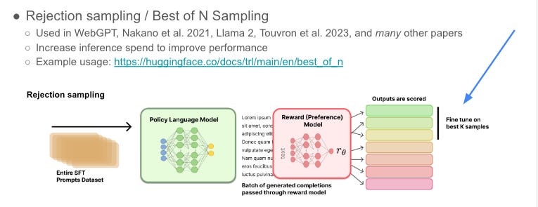 Rejection sampling / Best of N Sampling: the core idea here is that rather than just scoring pairwise generations, you are generating a lot more outputs (= more inference cost), score them all with your reward model and then pick the top N results. LLaMA2 used this approach, amongst many others.