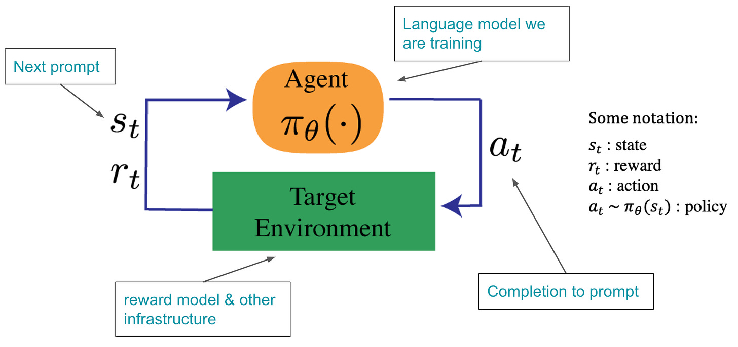 Nathan [00:13:47]: So reinforcement learning, I kind of mentioned this, it's a trial and error type of system. The diagram and the slides is really this classic thing where you have an agent interacting with an environment. So it's kind of this agent has some input to the environment, which is called the action. The environment returns a state and a reward and that repeats over time and the agent learns based on these states and these rewards that it's seeing and it should learn a policy that makes the rewards go up. That seems pretty simple than if you try to mentally map what this looks like in language, which is that like the language models don't make this easy. I think with the language model, it's very hard to define what an environment is. So if the language model is the policy and it's generating, it's like the environment should be a human, but setting up the infrastructure to take tens of thousands of prompts and generate them and then show them to a human and collect the human responses and then shove that into your training architecture is very far away from working. So we don't really have an environment. We just have a reward model that returns a reward and the state doesn't really exist when you look at it like an RL problem. What happens is the state is a prompt and then you do a completion and then you throw it away and you grab a new prompt. We're really in as an RL researcher, you would think of this as being like you take a state, you get some completion from it and then you look at what that is and you keep kind of iterating on it and all of that isn't here, which is why you'll hear RLHF referred to as bandits problem, which is kind of like you choose one action and then you watch the dynamics play out. There's many more debates that you can have in this. If you get the right RL people in the room, then kind of like this is an RL even when you zoom into what RLHF is doing.
