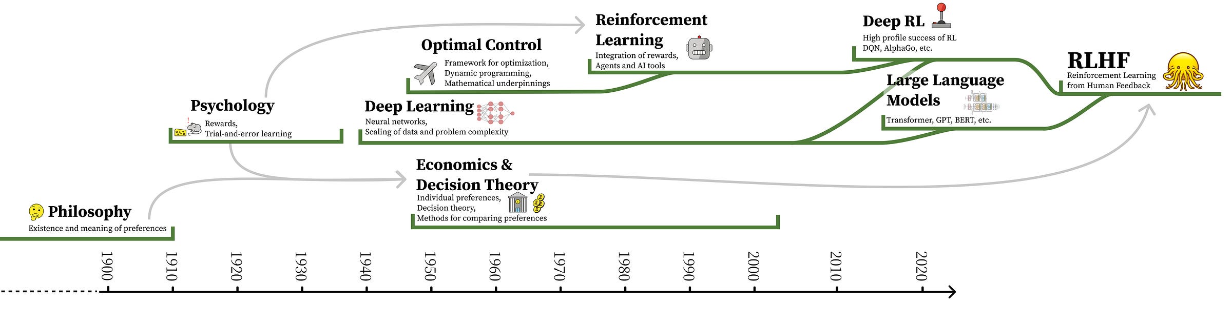Von Neumann–Morgenstern utility theorem: you can dive into the math here, but the TLDR is that when humans make decision there’s usually a “maximum utility” function that measures what the best decision would be; the fact that this function exists, makes it possible for RLHF to model human preferences and decision making.