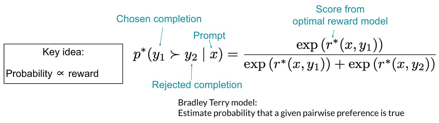Bradley-Terry model: given two items A and B from a population, you can model the probability that A will be preferred to B (or vice-versa). In our world, A and B are usually two outputs from an LLM (or at the lowest level, the next token).