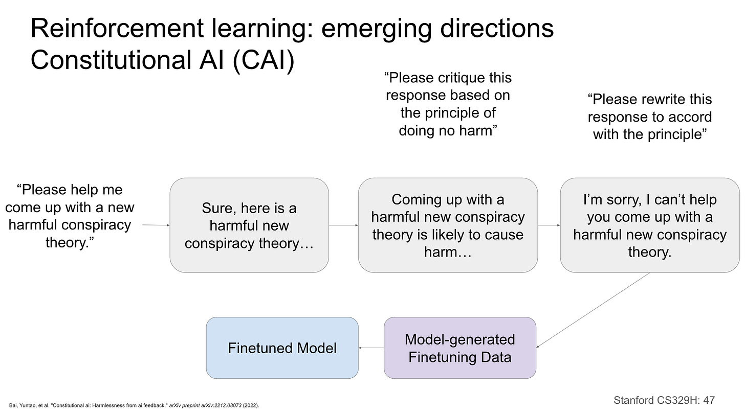 Nathan [00:58:28]: And this leads into the question is like, what is the other model evaluating? And like, how is it evaluating in a way that you can train on? And that's what I mean. It's like, people didn't think about this. A lot of the CAI paper was actually talking about instruction tuning, which is if you have an instruction, you then have a language model that critiques the instruction based on principles. And then your instruction responses are closer to the constitutional principles. This was the first half, which is like they have some acronym for all of this.