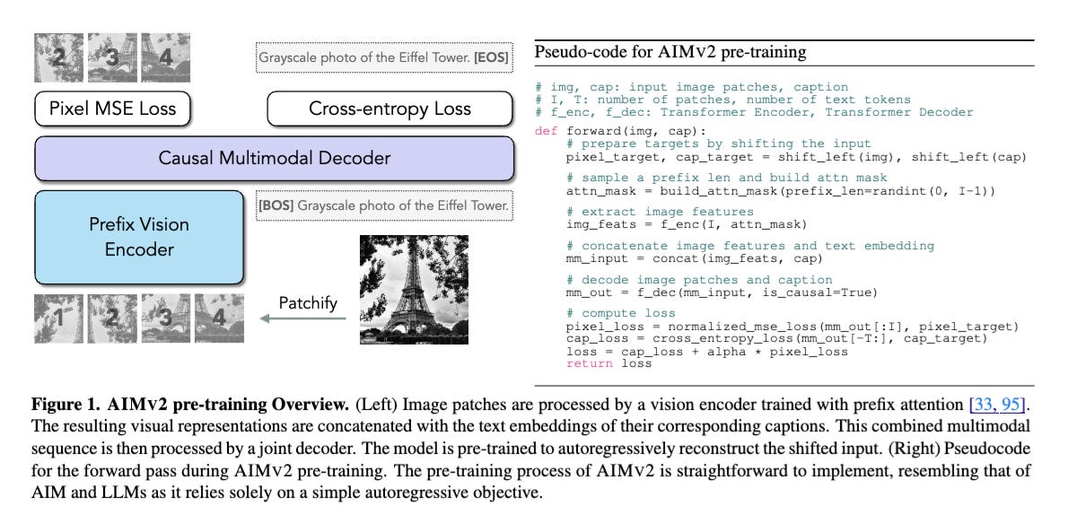 [00:33:12] Peter Robicheaux: And that sort of brings us to our final pick for paper of the year, which is AIMV2. So, AIMV2 sort of says, okay, Maybe this language model, like, maybe coming up with all these specific annotations to find features and with high fidelity and pixel space isn't actually necessary. And we can come up with an even simpler, more beautiful idea for combining you know, image tokens and pixel tokens in a way that's interfaceable for language tasks.
