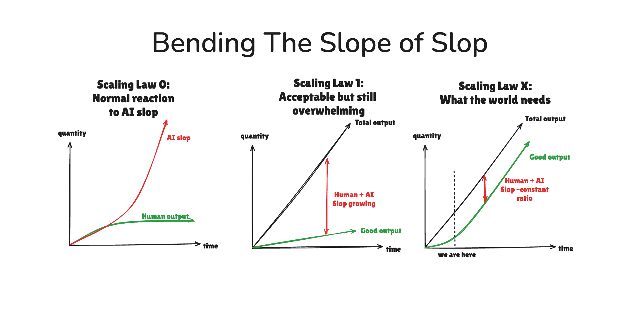 The most important problem in media now is scaling without slop, period, whether or not AI generated or entirely human-origin. Actually I lied, it’s not just a media problem: any act of creation and exercise of free will is is subject to the quality-quantity tradeoff, whether you’re building a new product or texting your adult kids.