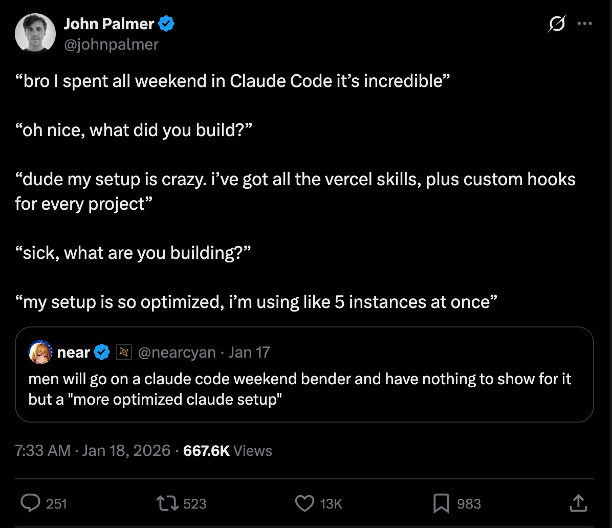 This was partially inspired by seeing the motivating factors behind products like Codemaps and Review, and partially a reaction to the “Canadian Girlfriend AI Coding” performative productivity porn that took over the timeline: