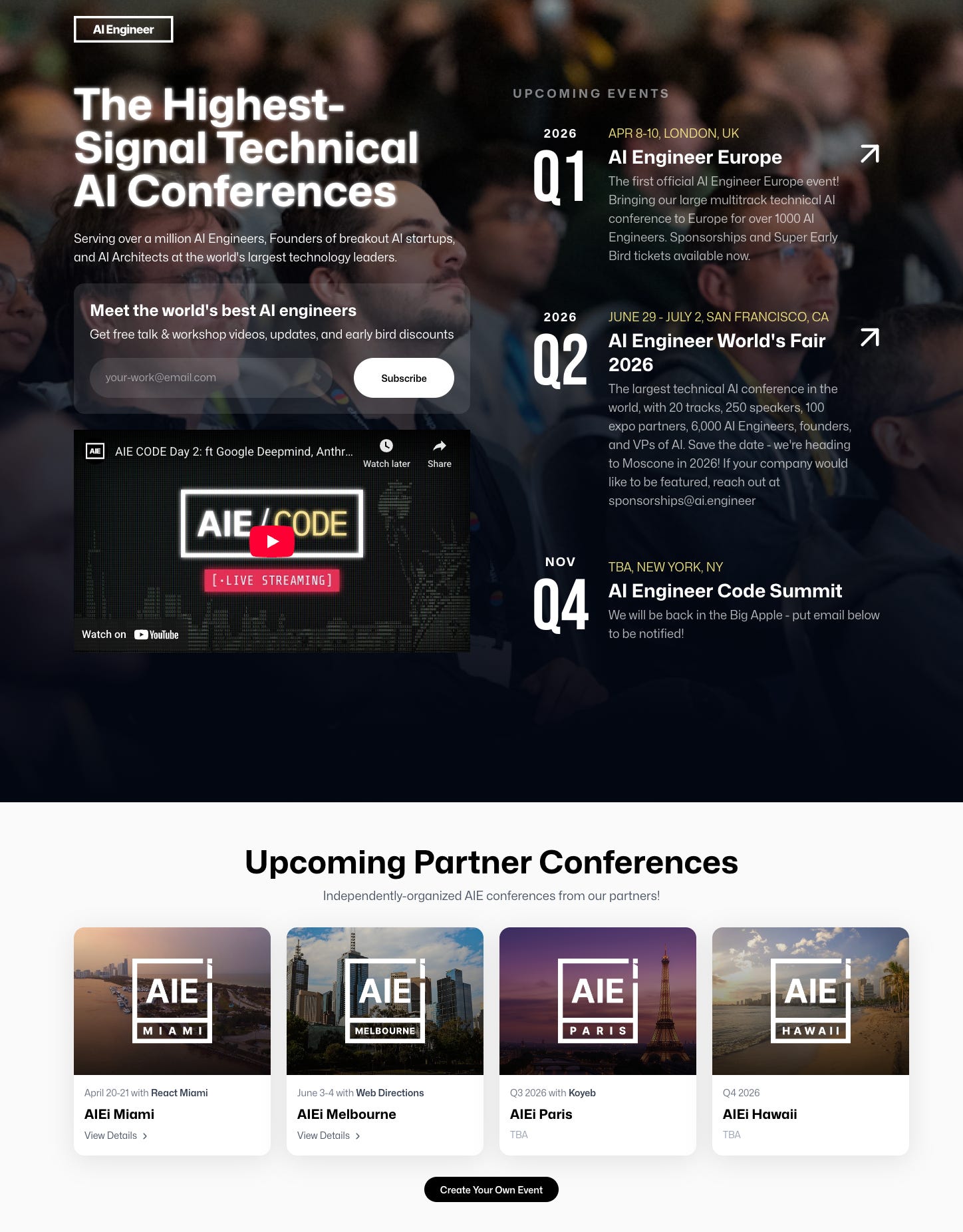 AI Engineer grew from one event a year in 2023 and 2024 to 4 (AIE NYC, AIE WF, AIE Paris, AIE CODE) in 2025, and there will be at least 7 AIEs around the world in 2026.