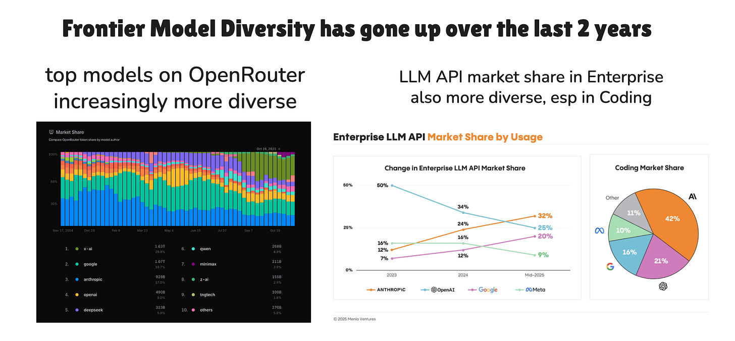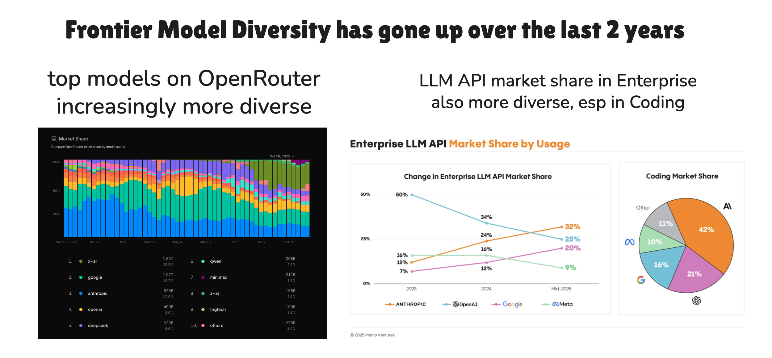 Model Diversity. the number of relevant frontier Model Labs has gone UP, not down, including Chinese/US open model labs, which means 1) you can capabilitymaxx across all of them, 2) people want to pay someone to capabilitymaxx for them. Often it’s an inhouse AI czar, but now it’s Agent Labs.