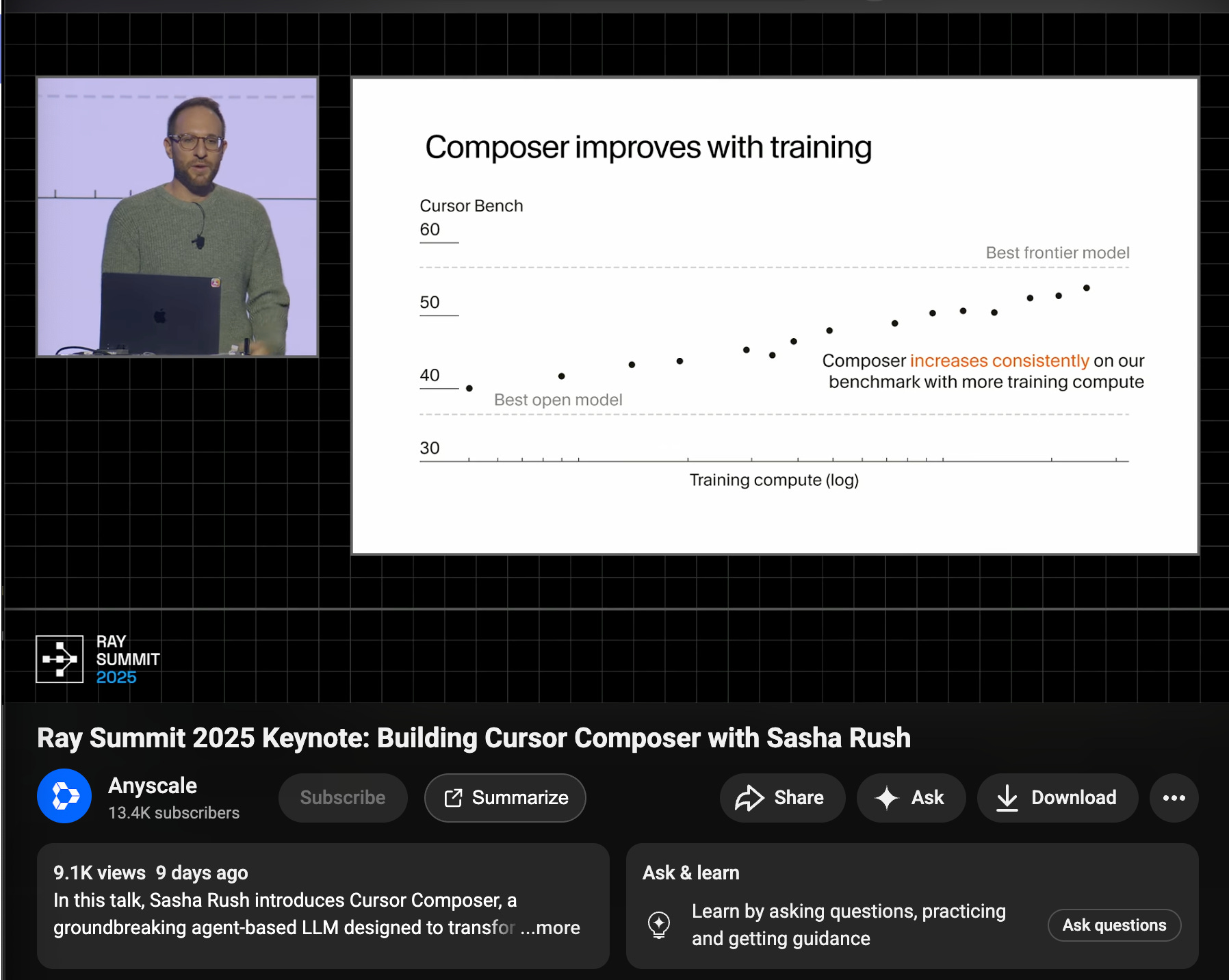 If you pay close attention to Sasha Rush’s talk at Ray Summit, you can notice that the x axis is log scale, which, while it is not quantified, can be presumed that Cursor is now saying their post-training can largely make up the gap between the best open models and the best frontier models. How long more until they start exceeding?