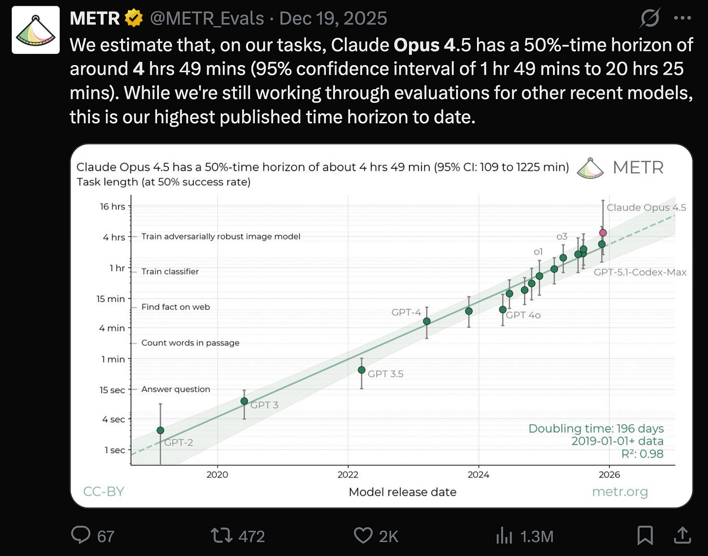 This is a somewhat different but directionally similar story with the famous METR chart, which, as we explain in our upcoming podcast with them, because it picks the 50th percentile success rate of HUMAN EQUIVALENT HOURS instead of the 99.9th percentile long tail autonomy of Claude Code autonomous execution, shows a very different (and volatile at the extremes) trend of almost 5 hours of human work done by agents: