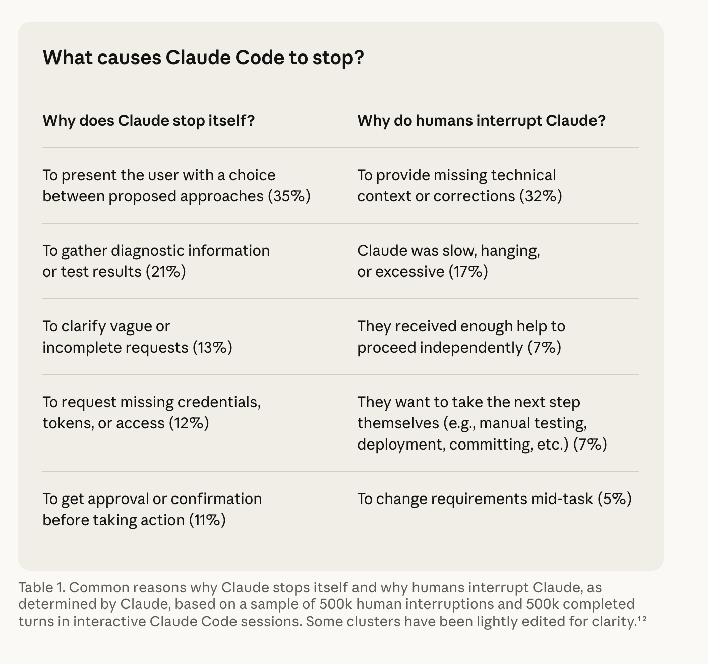 There’s also good analysis of when -Claude- interrupts the flow to ask for clarification, with decent calibration and good breakdown of reasons with frequency: