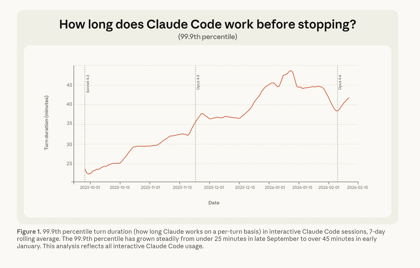 Most of the post is about Claude Code usage. We see Anthropic’s side of the “increasing autonomy story” - starting at 25 mins in Sept to over 45 mins in Jan, with a dip coinciding with the sudden 2x jump in userbase in Jan-Feb 2026, and then rebounding with the release of Opus 4.6.