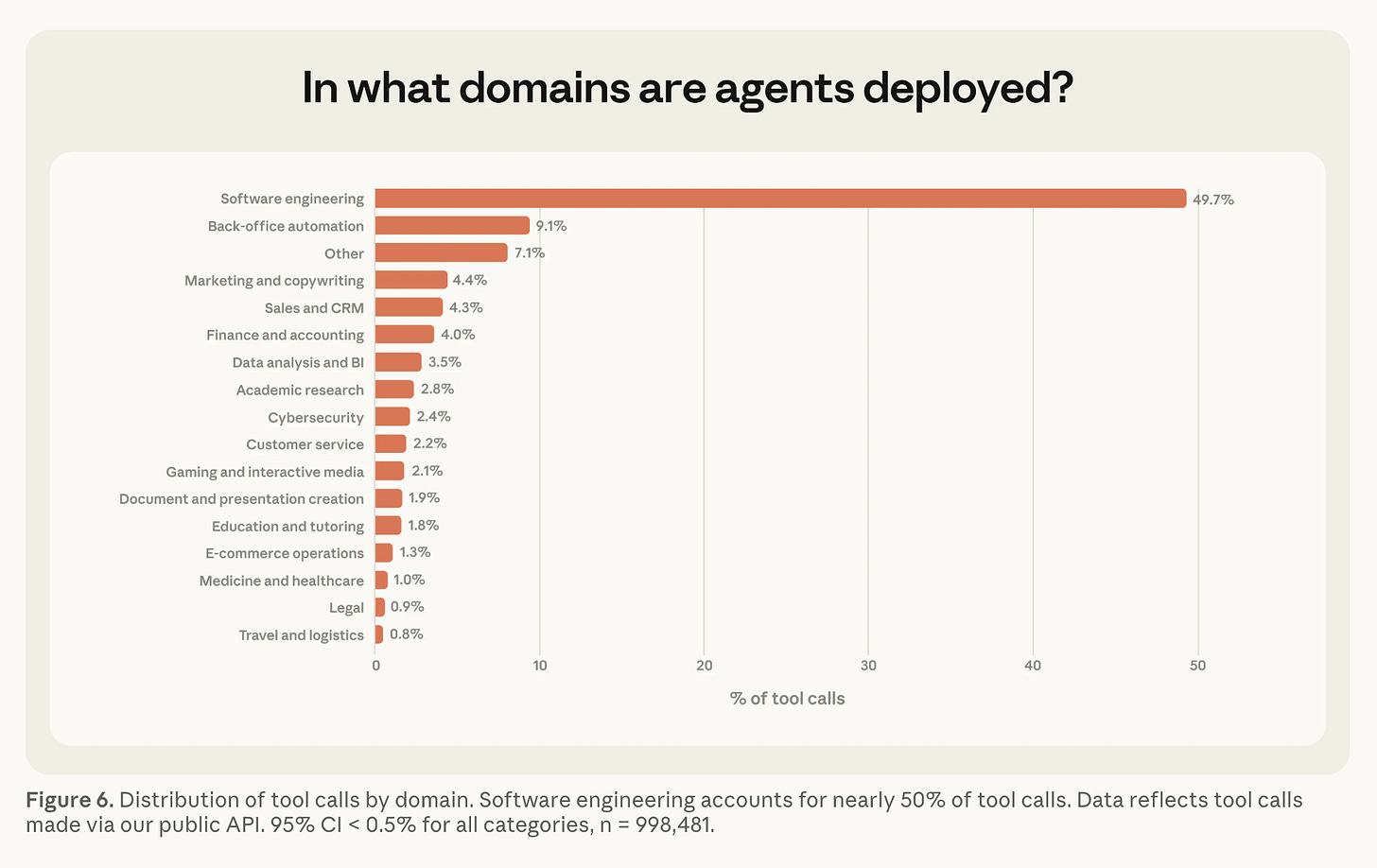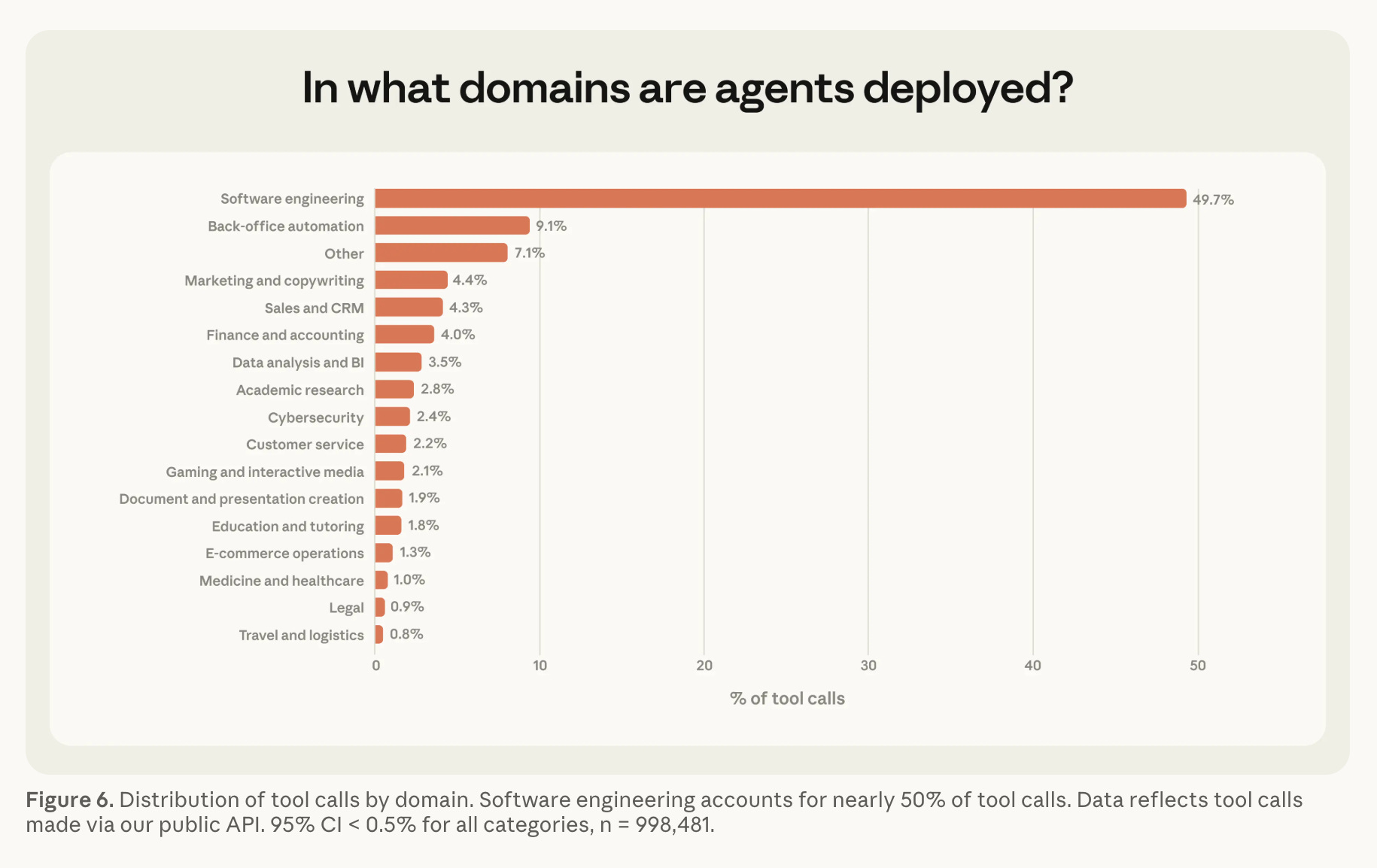 However, all that will pass. What we’d highlight today is Anthropic’s study of its own API usage patterns, Measuring AI agent autonomy in practice. As you might expect, most usage is coding, but you can start to go down the list of the other uses and pick off the next likely targets for agents: