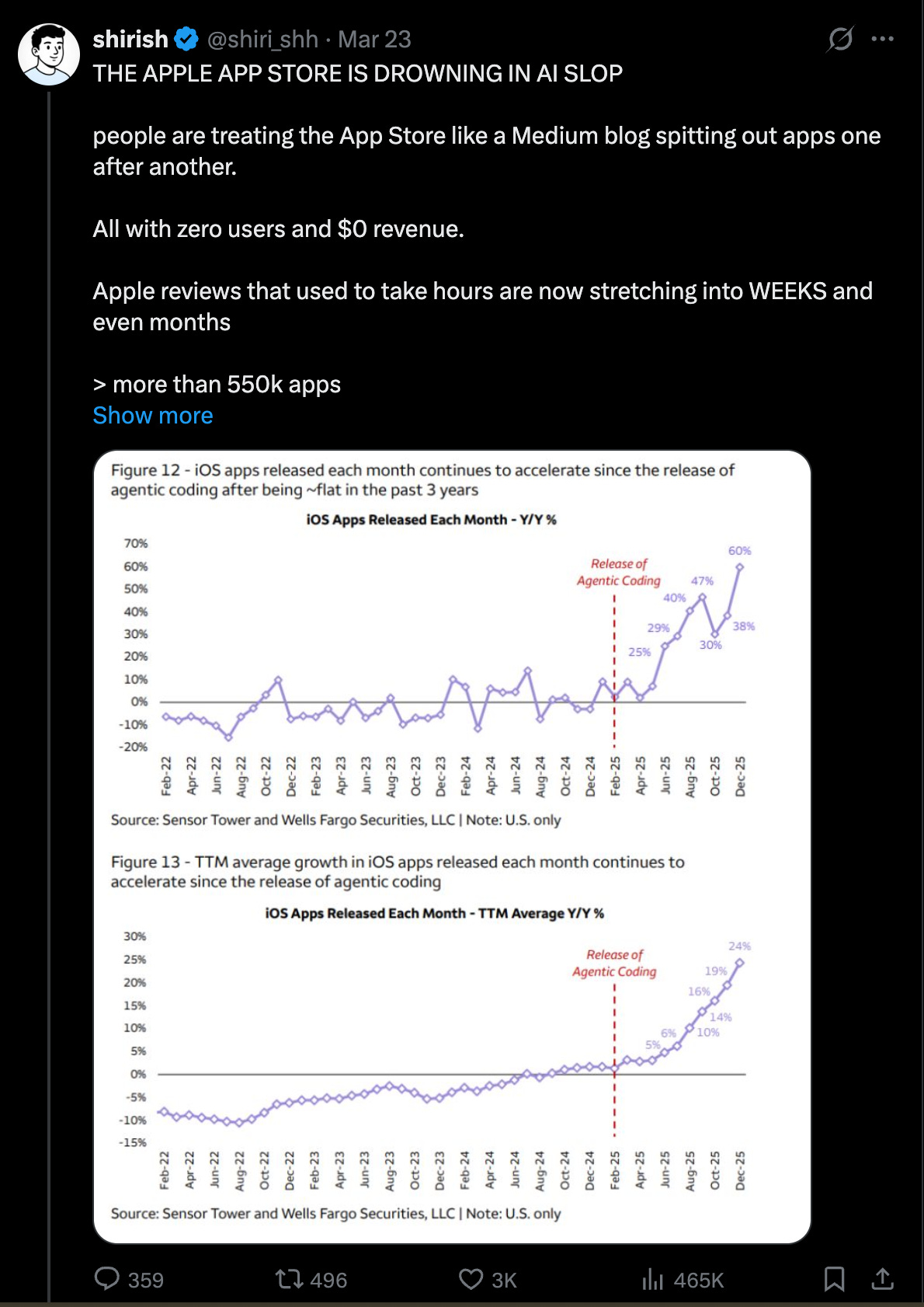 Even as the debate rages on about AI killing all SaaS, the ability to vibecode apps and hopefully buy a ticket to a >$100M exit as an 18 year old high school dropout means that ~everyone with any entrepreneurial spirit is going to at least try it, and traditional app store review processes will die. This comes even as Apple starts blocking vibe code apps like Replit and Vibecode on policy reasons, and, even though there were legitimately defensible issues, it is clear that the normal app distribution paradigms are completely breaking down in 2026. We declared the War on Slop a key theme for 2026 in Jan, and now this is one of the most important charts in the world for thinking through it’s ramifications on the decades-long supremacy of the Apple App Store as well as other similar software distribution platforms vs the open web.