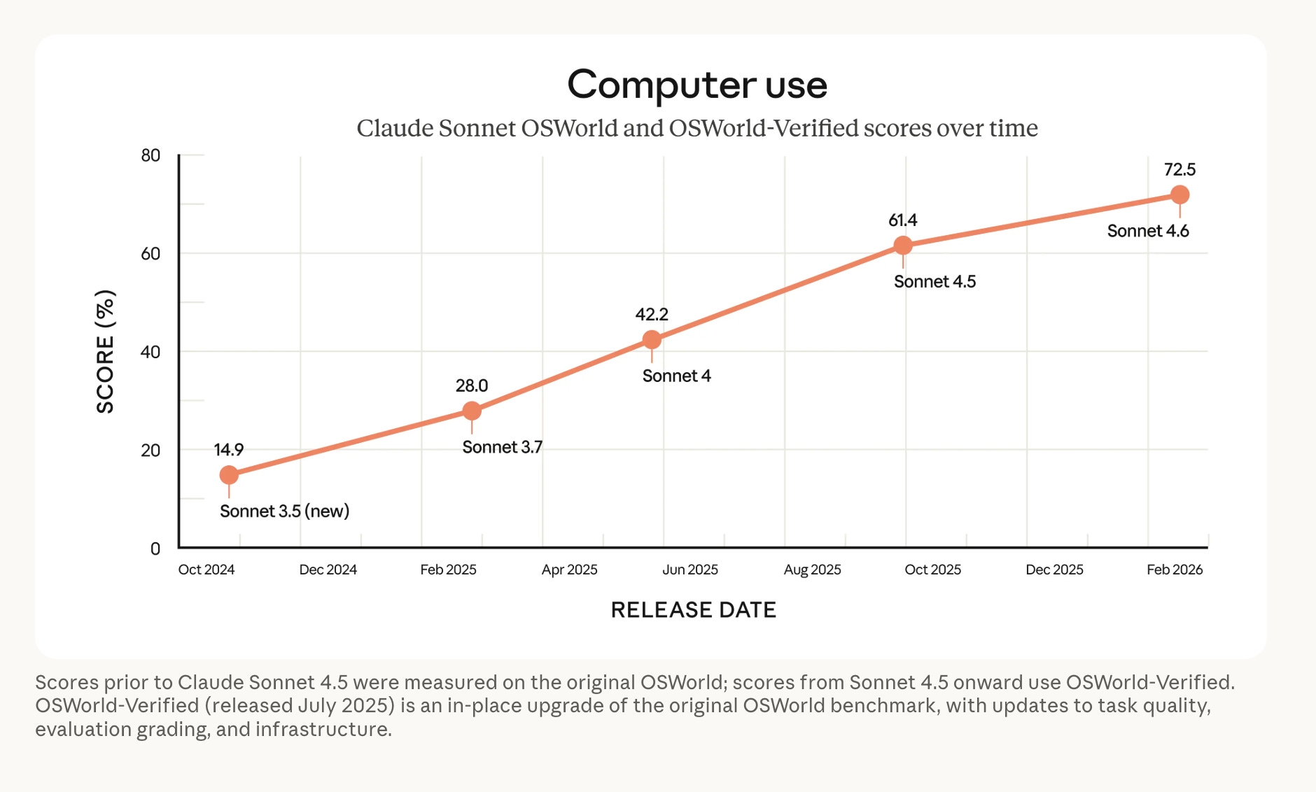 GDPval-AA uses an agentic harness (shell + browsing loop), and Sonnet 4.6’s lead is reported under a specific setup (“adaptive thinking mode”, “max effort”) [@ArtificialAnlys]. Cursor’s note that it’s better on longer tasks but below Opus for raw intelligence [@cursor_ai] reinforces that “best model” is not a scalar; it’s workload × harness × budget.Computer use is becoming a marquee capability, and Sonnet is being pushed there.