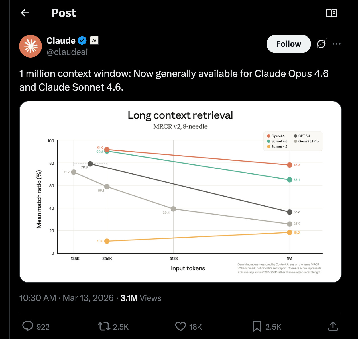 Anthropic is rightfully being celebrated today for releasing their 1M context models in GA, with SOTA MRCR results that fight Context Rot for as long as possible: