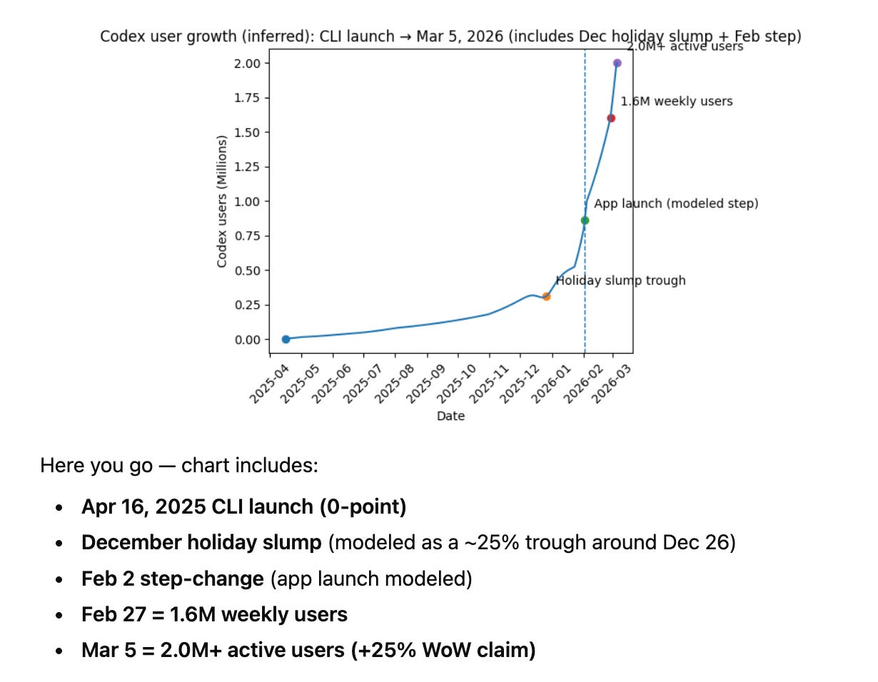 Mostly the content machine of Anthropic ($19B ARR) stacked up vs the generally better benchmarks of OpenAI ($25B ARR). We warned back then not to take first reactions too seriously, and that bore out. Here’s Codex plotting it’s own user growth jumping by over 1 million developers since exactly 1 month ago: