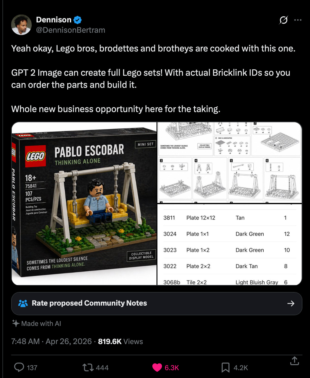 But that isn’t quite the argument we’re making here. What we’re focusing on is the very literal and serious question of whether or not models like Nano Banana or GPT-Image-2 or Grok Imagine are necessary uses of scarce GPU capacity if you are eschewing “side quests” and seriously pursuing AGI and trying to hit the revenue, efficiency, and funding goals necessary to not die along the way.