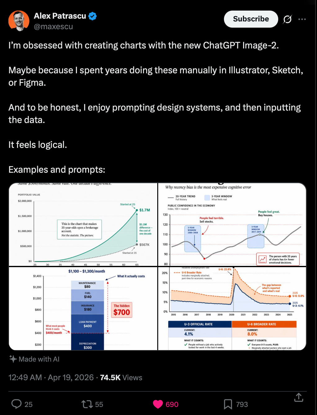 As every lab sprints toward being some form of Anthropic (aka having a coding and enterprise AI focus, producing ever better PDFs and PPTs and spreadsheets), it is still refreshing to see that GPT-Image-2 is continuing to drive more creative applications, for example this: