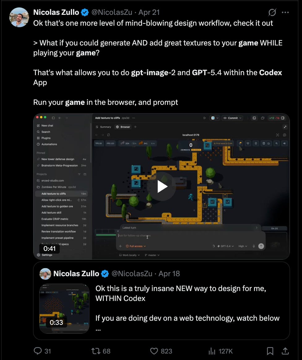 And of course the GPT-Image-2 + Codex combo, which is available as a skill in Codex, which you can iteratively use to generate assets WHILE you code: