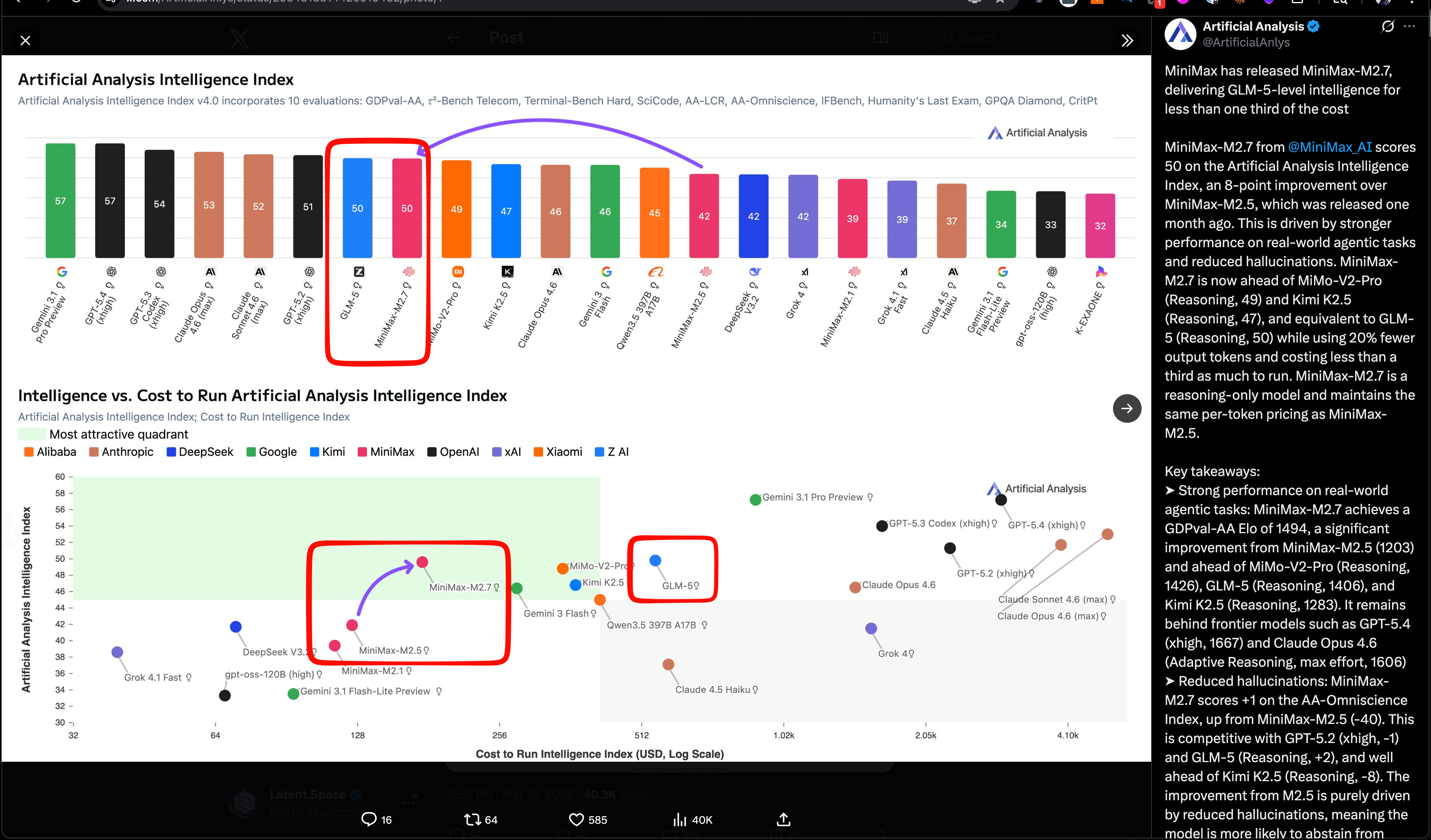 Not 2 months after their IPO and first public quarter, MiniMax is back in the news with MiniMax 2.7, a nice bright spot in Chinese Open Models after the changeover in Qwen. They match Z.ai’s GLM-5 SOTA open model from last month, but the story is efficiency here (see green quadrant in Artificial Analysis’ chart):