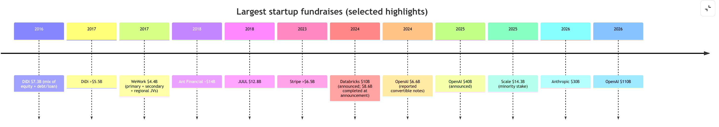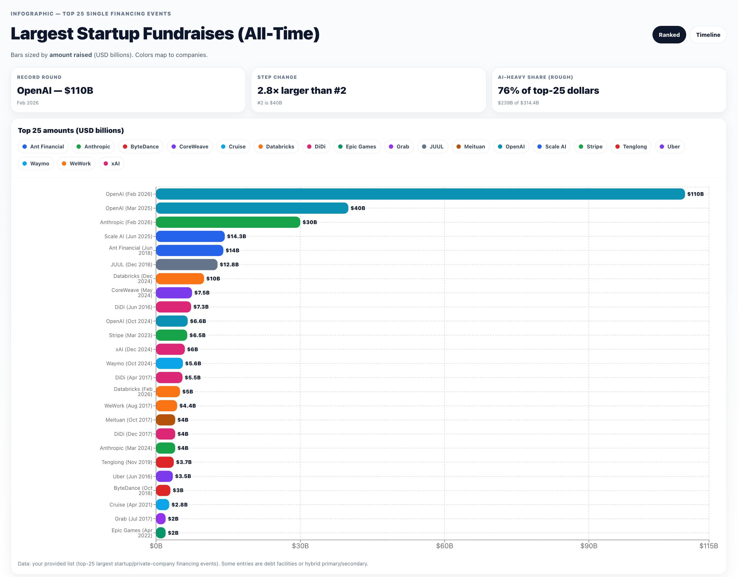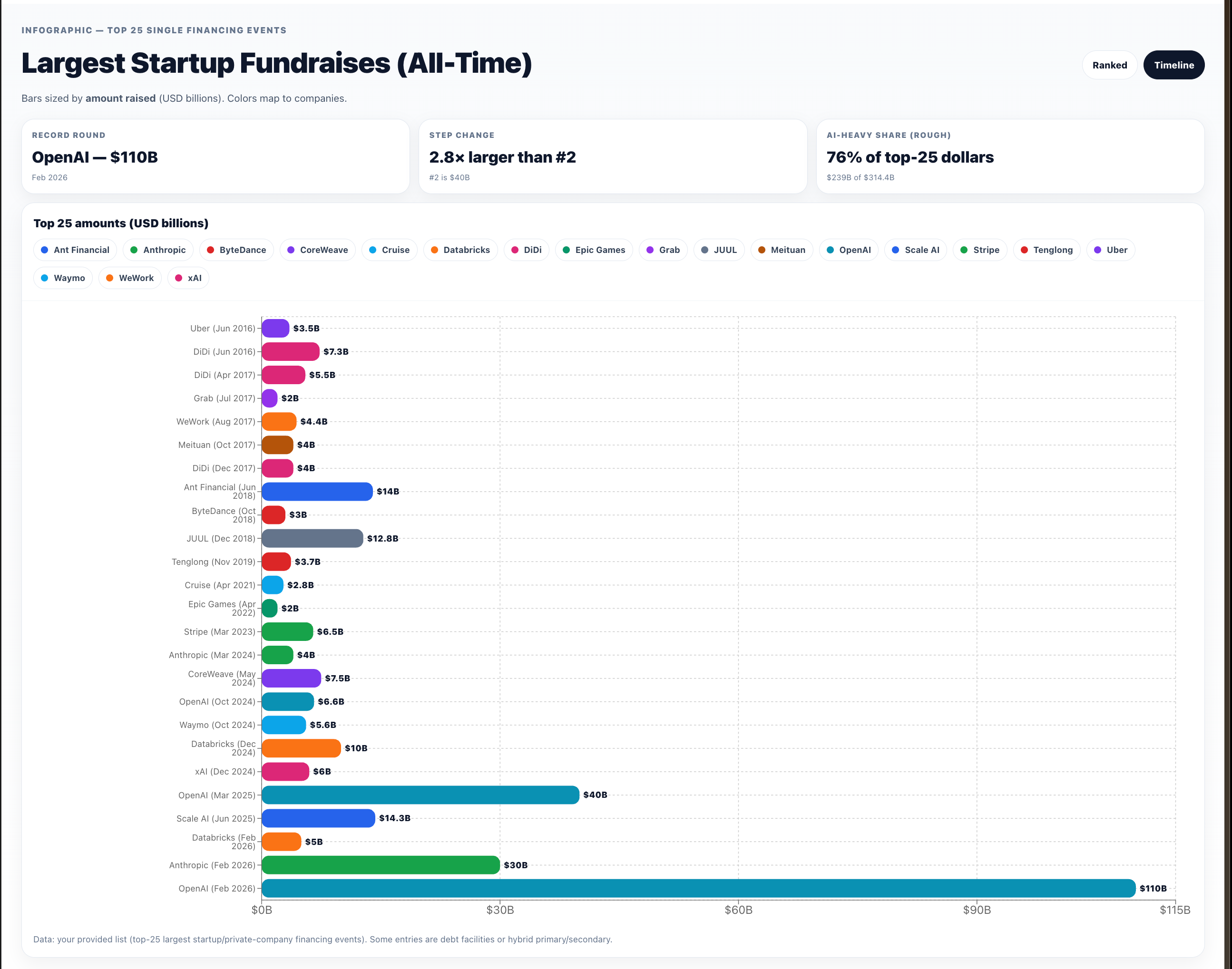 To put this in perspective, 118 countries/economies have a nominal GDP below $100B — roughly 61% of all world economies. Because the consecutive “largest fundraises in history” are too big to fit in a human head, here’s a chart worthy of wtfhappened2025.com: