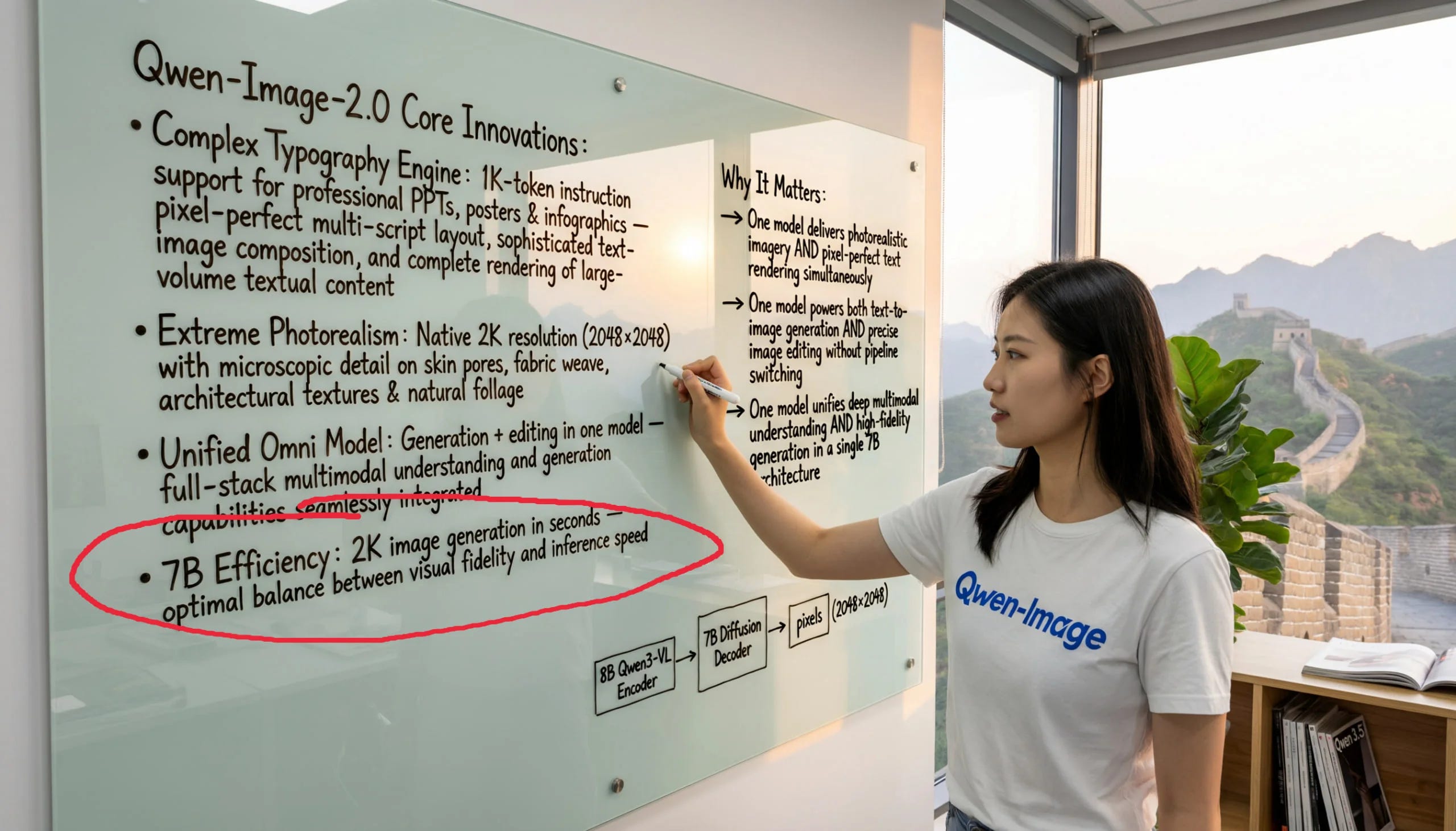 The Qwen-Image-2.0 model is notable for its ability to generate and edit images with a unified 7B parameter architecture, supporting native 2K resolution and text rendering. This is a significant advancement as it combines both generation and editing capabilities in a single model, which is not commonly seen in other models of similar scale.