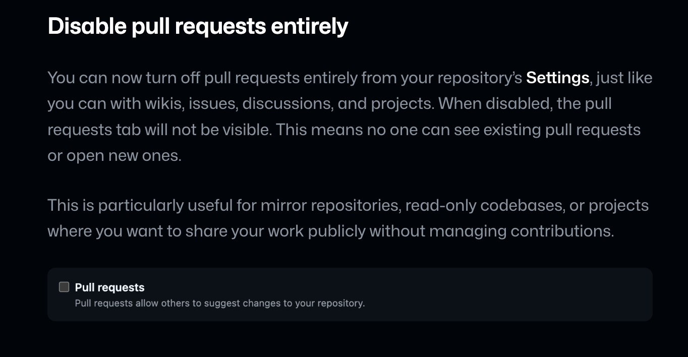 Pull Requests were arguably invented in 2005, successfully popularized by GitHub, and only 21 years later, GitHub is for the first time in history allowing people to disable pull requests on their open source repos (you could only disable issues before).