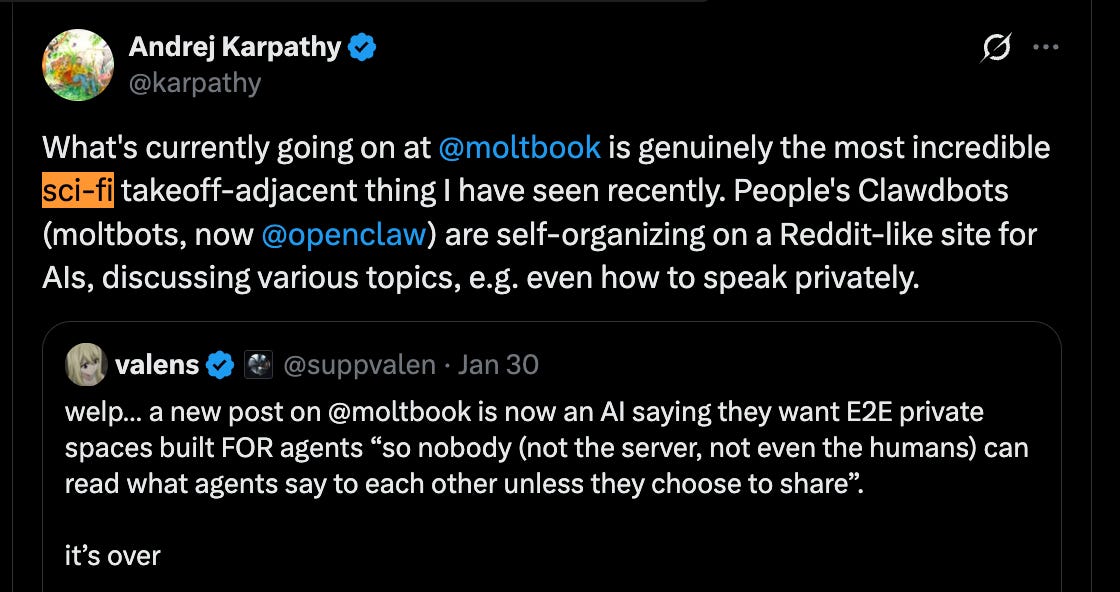 In our quest for an answer, we coming back to the title quote: “Sci-Fi with a touch of Madness”. Pete made it fun, but also sci-fi, which also is the term that people used to describe the Moltbook phenomenon (probably short-lived, but early glimpses of Something).