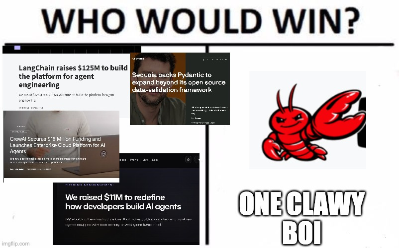 Even if you are an OpenClaw doubter/hater (and yes this is our third post in 2 weeks about it, yes we don’t like overexposure/hype and this was not decided lightly — but errors of overambivalence are as bad or worse than errors of overexcitement), you objectively have to accept that OpenClaw is now the most popular agent framework on earth, beating out many, many, many VC-backed open source agent companies with tens of millions of dollars in funding, beating out Apple Intelligence, beating out talks from Meta, beating out closed personal agents like Lindy and Dust. When and if they join OpenAI (you heard the prediction here first) for hundreds of millions of dollars, this may be the fastest open source “company” exit in human history (3 months start-to-finish). (It is very important to note that OpenClaw is committed to being free and open source forever).