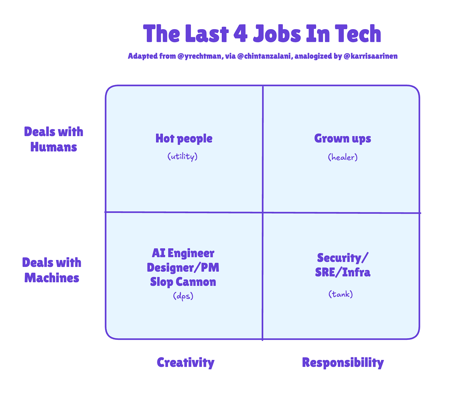 Karri Saarinen, CEO of Linear, made a popular analogy to the teamwork roles that emerged in World of Warcraft. This is a good 2D augmentation of an earlier age-based company model (much less realistic, name a tech company that fits the latter format, they exist but are very hard to find):