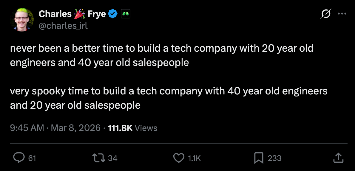 It’s well known that org charts are changing with AI - the first trend we called out was in 2023 with the Rise of the AI Engineer (now an official org at Meta!), and then in 2025 with Tiny Teams (hired by Meta!), but it seems Yoni Rechtman over at the 99D Substack has the mental model for the new post-AI roles (at least in white collar tech):