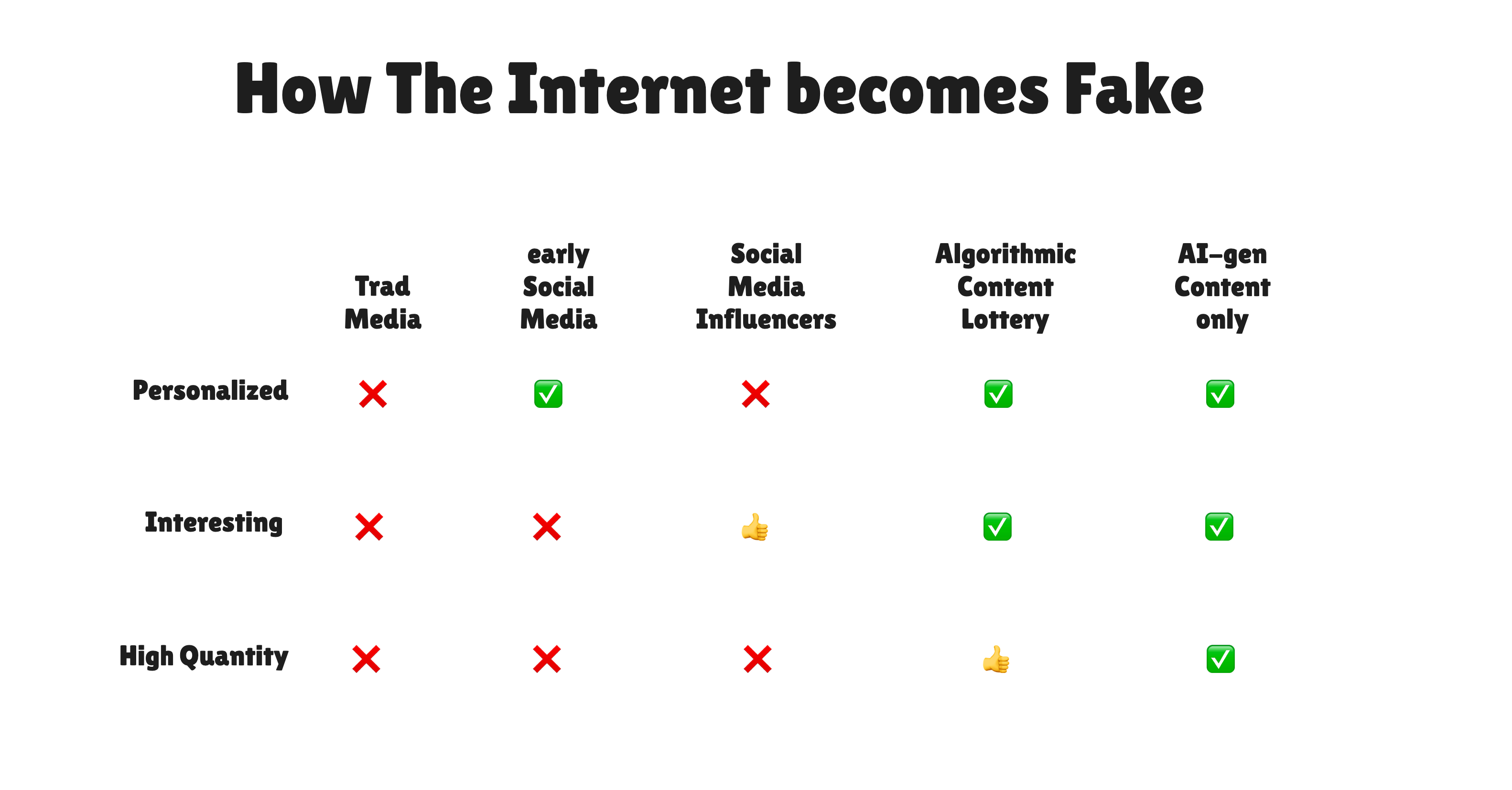 It would be different if we voted with our thumbs. Dead Internet Theory is not solely caused by AI, but is accelerated by it. I am reminded of an old social media evolution framework that goes like this: