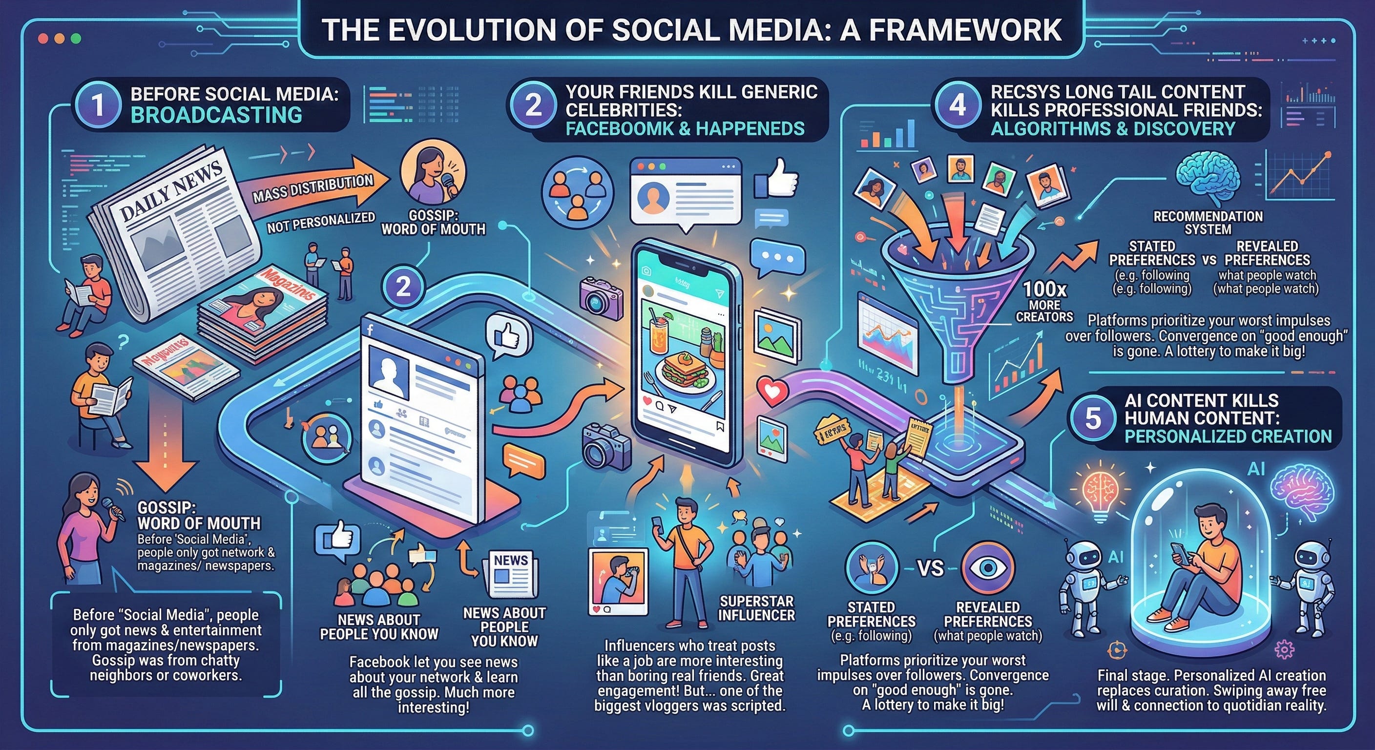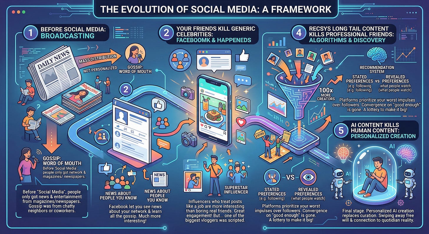 Recsys Long Tail Content kills Professional Friends: The problem with professional friends is that they had the same problem as the generic celebrities of old — they converge on “merely good enough” for most. They also bring new problems: even when being paid millions they still don’t produce enough content , and, yet, they are also divas who wield too much power over the platforms. So: the platforms stop prioritizing your follow graph (stated preferences) and start feeding your worst impulses (revealed preferences). Another huge jump in engagement, and 100x more creators are given the lottery ticket to Make It Big!