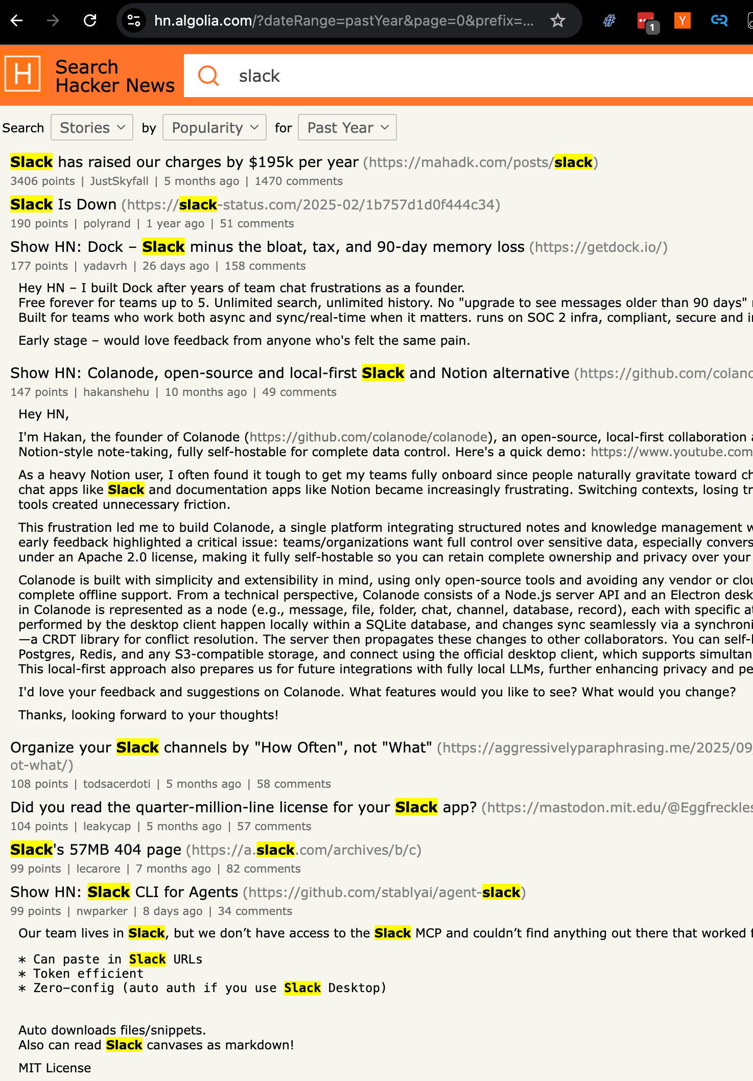 Slack rejected developer community and went upmarket in 2019, then Salesforce bought it for $27.7B in 2021, and ever since then Slack has been on a slow rachet up in prices and has struggled to introduce compelling new AI features (Slack AI is occasionally useful but impossible to discover/learn/personalize) while facing constant outages. NPS feels low, and yet every organization in tech uses it.