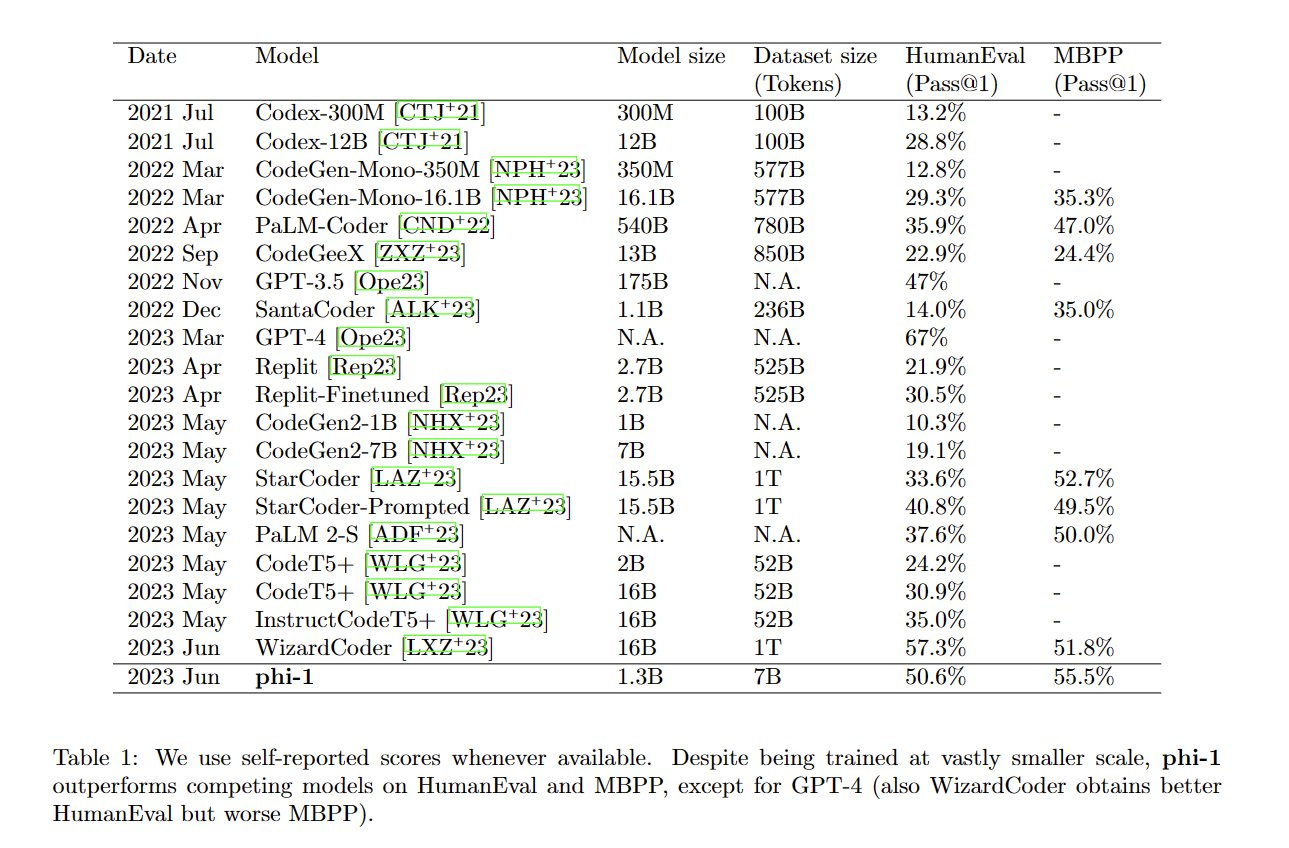 phi-1 achieves 51% on HumanEval w. only 1.3B parameters & 7B tokens training dataset and 8 A100s x 4 days = 800 A100-hours. Any other >50% HumanEval model is >1000x bigger (e.g., WizardCoder from last week is 10x in model size and 100x in dataset size).