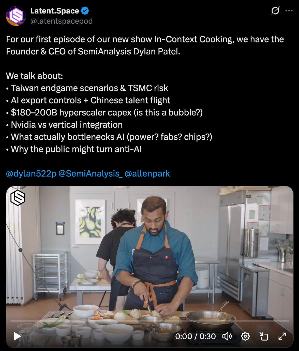 Dylan joins us in the kitchen to recreate restaurant-style chicken fried rice while unpacking Taiwan endgames, export controls, Nvidia’s paranoia advantage, why Amazon and Google are about to light $200B/year on fire (intentionally), and why the biggest AI risk might not be China but voters.