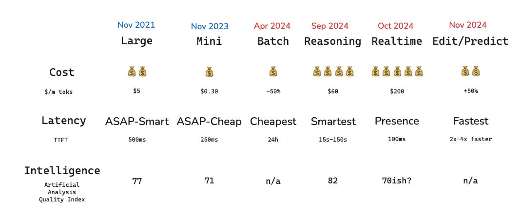 o1 made it consensus that thoughtful, slower “System 2” models are a great complement to the standard fastest-time-to-first-token “System 1” models. However, there are more than just “fast” and “slow” needs arising in AI engineered systems, and we can benefit from a useful model of tradeoffs in cost, speed, and intelligence.