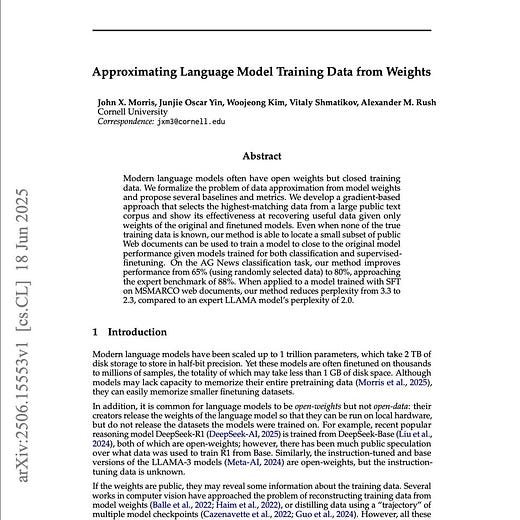 Approximating Language Model Training Data from Weights: https://arxiv.org/abs/2506.15553