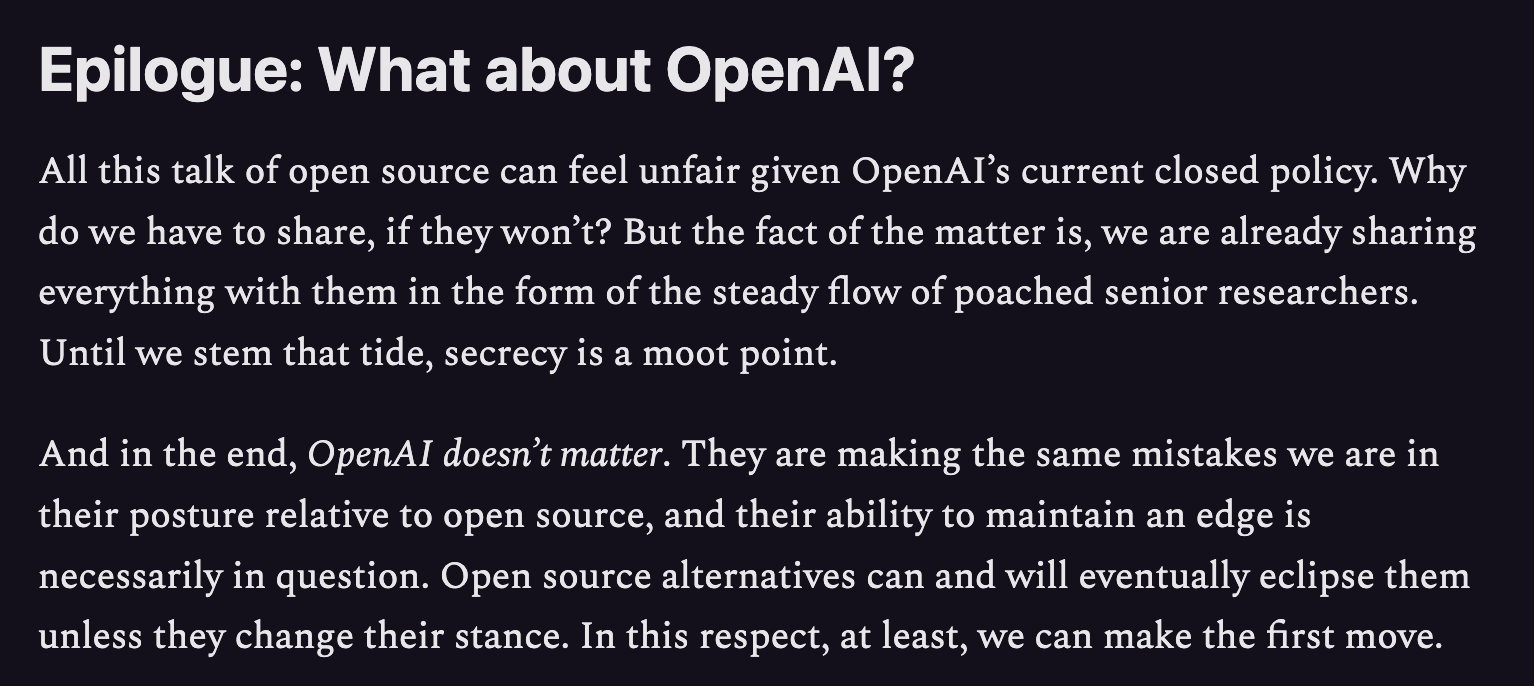 Google’s misfortunes are well understood by now, but the last paragraph of the memo: “We have no moat, and neither does OpenAI”, was a banger of a mic drop.