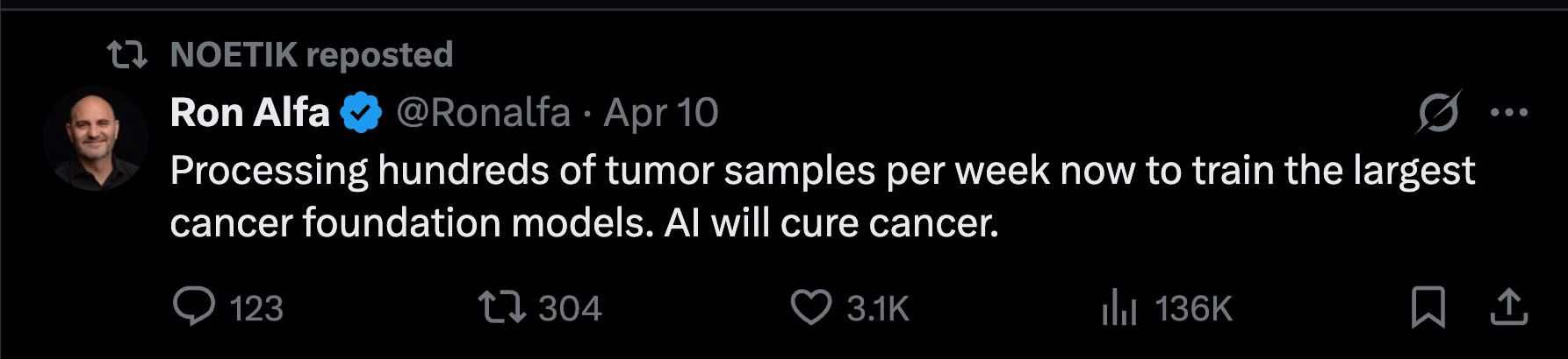 Are we leaving something on the table? Enter Noetik and Ron Alfa. Ronβs core thesis is that many of these βfailedβ treatments actually work! But weβre not looking at the right patients with the right tumors. If only we had a way to really understand the unique types of cancer biologies and which patients will respond to which treatments, we might be able to show a much higher success rate. Millions of lives (and billions of dollars) may ride on this.