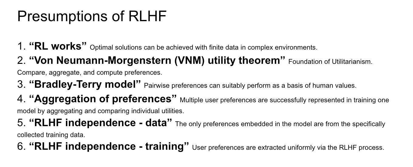 Swyx [00:10:09]: You have a nice chart of like the sort of intellectual history of RLHF that we'll send people to refer to either in your paper or in the YouTube video for this podcast. But I like the other slide that you have on like the presumptions that you need to have for RLHF to work. You already mentioned some of those. Which one's underappreciated? Like, this is the first time I've come across the VNM Utility Theorem.