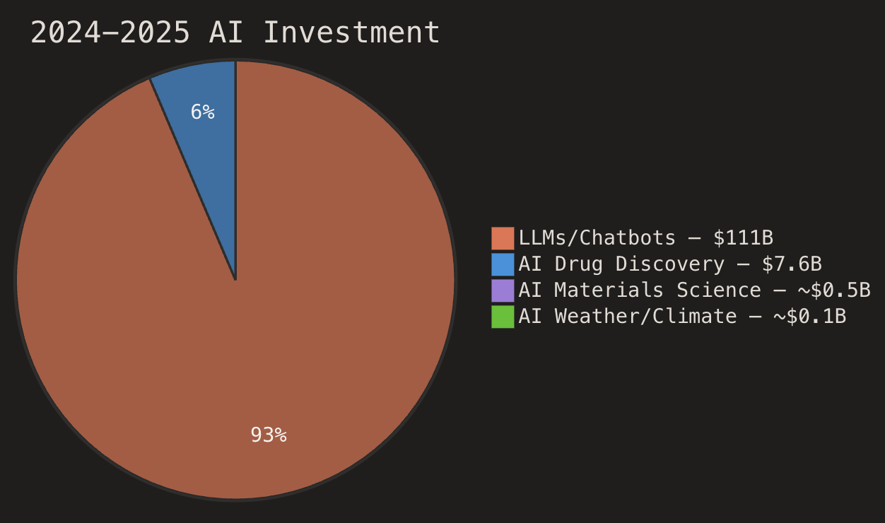 Unless Anthropic starts building protein folding models, we shouldn’t expect them to solve diseases. Unless OpenAI starts building geospatial models, we shouldn’t expect them to become frontier weather forecasters. The big labs are focused on intelligence—reasoning, long context, tool use. Domain-specific simulation and data collection are massive undertakings that lie outside their core competencies and business models.