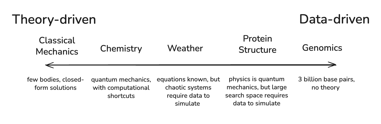 Why are simulators valuable? The core distinction between scientists and simulators, per our definition, is the reliance on text and reasoning as opposed to the reliance on domain-specific foundation models. Reasoning is sufficient when a domain has enough theoretical structure to support chain-of-thought derivation, but when theory is lacking, we require models that can learn directly from the data. The question of when this transition happens points to a deeper tension at the heart of scientific modeling: when can you derive predictions from theory and first principles, and when do you have to build models that pattern-match from empirics?