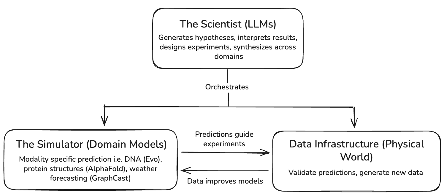Scientists (LLMs) and simulators (domain models) are different programs within ML research that require distinct talent pools and data infrastructure, and they must work together to produce coherent models of the world. The full stack for AI-driven scientific discovery looks like this: