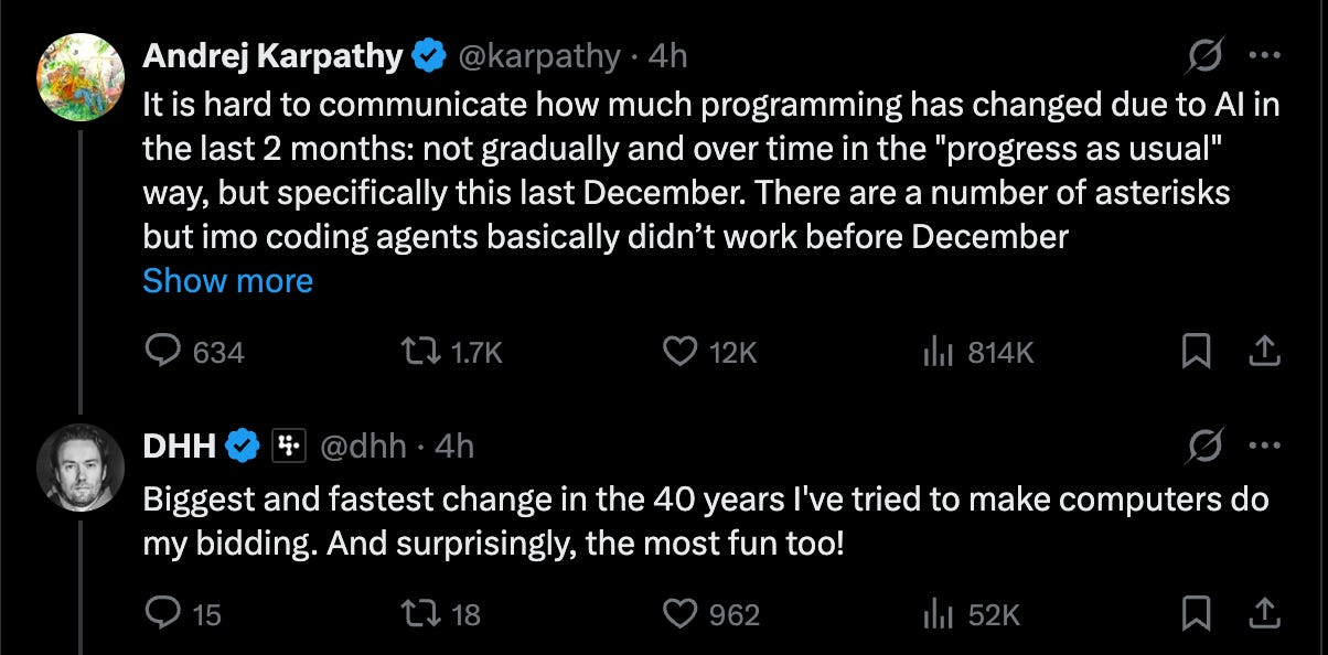 You can see Andrej trying to articulate his feelings about it in real time, from the original vibe coding tweet to agentic engineering. Today he joins a chorus of people calling out December 2025 (where Opus 4.5, Gemini 3, and GPT 5.2 on the OpenAI 10 year anniversary were all released in quick succession) as a major turning point: